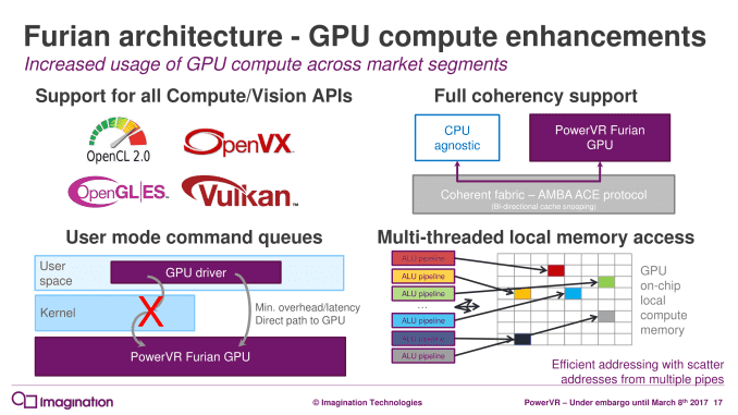 At a higher level, the compute capabilities of Furian will easily exceed those of Rogue. The architecture is designed to be OpenCL 2.x capable (conformance results pending), and there will be variations that are fully cache/memory coherent for heterogeneous processing. On that note, while it’s not outright HSA compliant, Furian adopts many of the hardware conventions of HSA, so it should behave like other heterogeneous solutions.