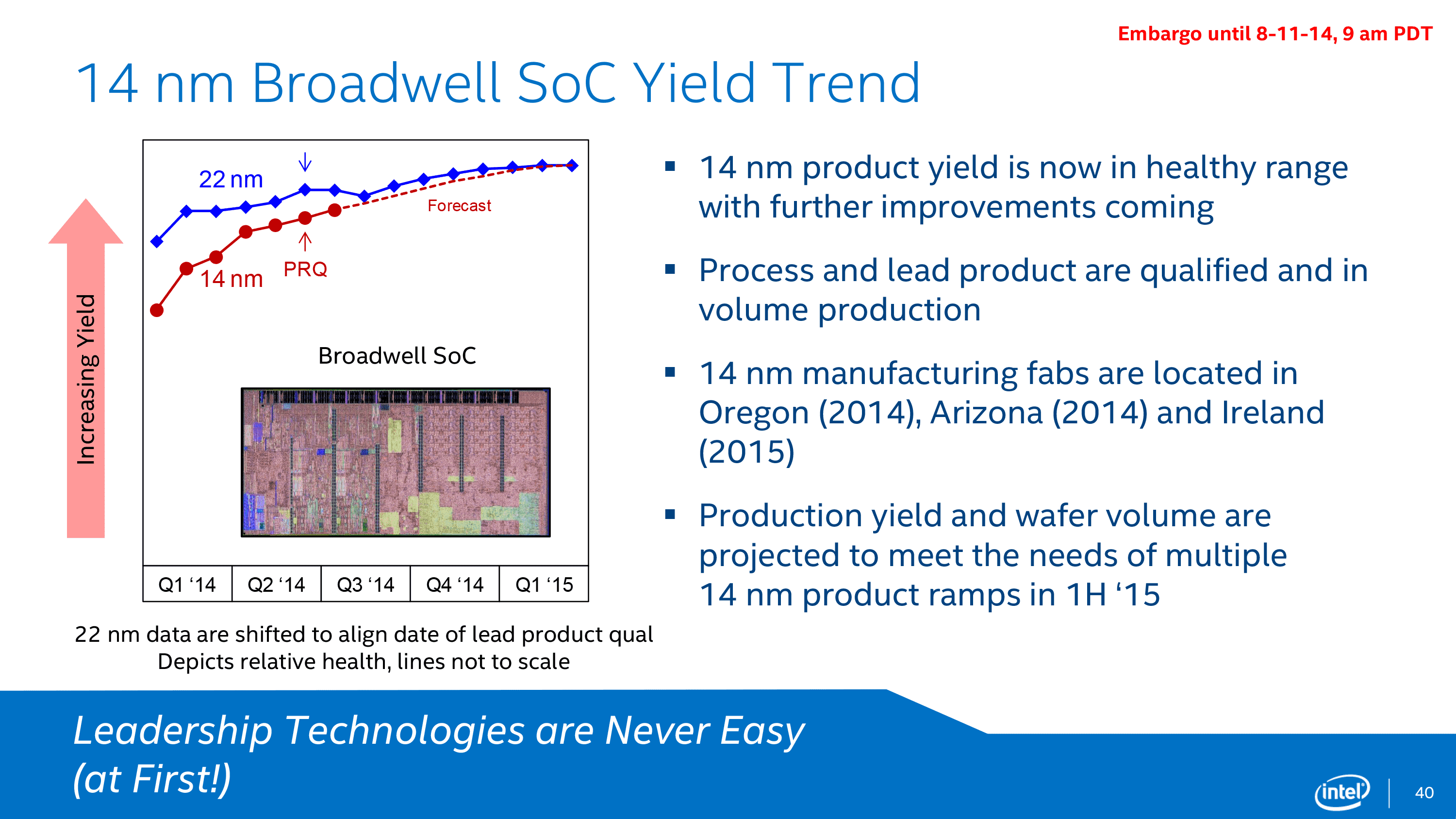Intel’s two year processor cadence of Tick-Tock allowed the company to alternate reducing the lithography node (a tick) with an upgraded microarchitecture (a tock) with modest gains of performance. Each stage of the Tick-Tock would take 12-15 months, with new lithography nodes taking longer and longer to reach maturity. Eventually it has gotten to a point where 14nm took too long to become pervasive in Intel’s product stack. For a manufacturing company and a CPU company, slowly rolling out Broadwell notebook and low power parts and then gutting the mid-range desktop was the result of the troubles of bringing 14nm to the prime time. Now in 2016 we have the launch of full-sized Broadwell-EP server parts running up to 22 cores in a 145W envelope, but the low power parts are a couple of microarchitectures ahead. We have this strange situation of a stretched landscape, partially driven by markets but also for manufacturing.