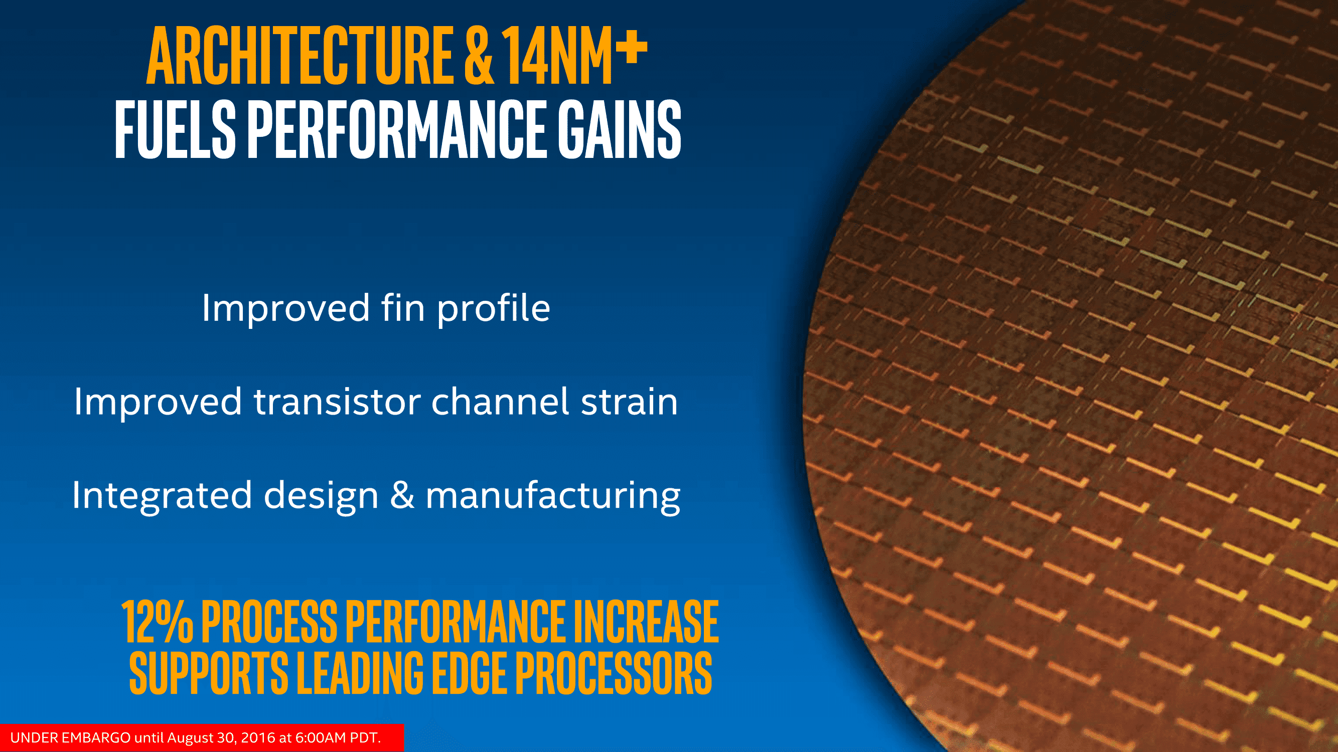 This means three bites of the cherry for 14nm before we see 10nm in prime time. First it was Broadwell, then Skylake, and today Intel is announcing Kaby Lake. As part of the release, Intel has mentioned that a number of key benefits for Kaby Lake will be based on an optimized 14nm process, called 14PLUS (or 14nm+, 14FF+). This process as a quick summary has a higher fin height and larger pitch, essentially giving a less-dense set of transistors that have more room to breathe. Normally a larger pitch means more voltage required, but this is offset by the fin height and Intel says is good for another few hundred MHz for performance. The less-dense design, in theory, may also help in overclocking, however we will have to wait until January to see those results.