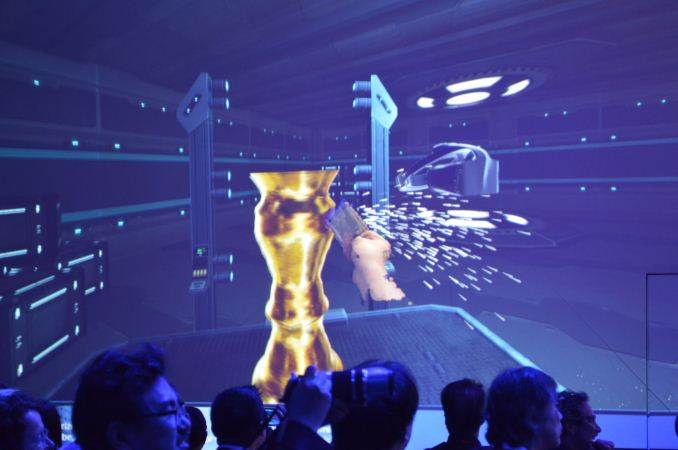 The demo was also projected onto a large screen, and it was clear this is still a prototype as we could see dropped frames. It was mentioned that Holo-Lens used Cherry Trail, and this is more powerful. Another element of use was a mix of 2D/3D environments, such as the eponymous ‘unlimited desktop’ for working and consuming content. The use of RealSense will be similar to at least one other headset with an external camera, but the rendered video on screen showed a person manipulating 2D interfaces projected onto walls with a remote control.