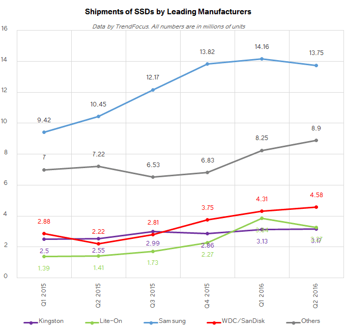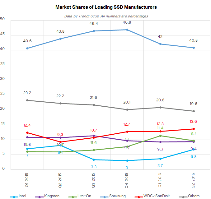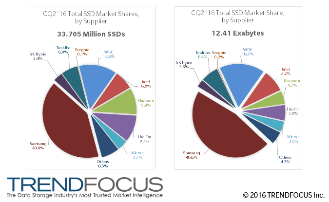Western Digital’s SanDisk retained #2 position in the SSD market for Q2: it shipped 4.58 million drives (up 106% YoY and 6.2% QoQ) and increased its market share to 13.6% in Q2 2016. What is even more important is that the company doubled the amount of NAND flash memory it used for its SSDs from the previous quarter (2.07 EB vs 0.98 EB) and nearly quadrupled it from the same period a year ago (0.54 EB). The average capacity of a SanDisk SSD in the second quarter was 452 GB, according to TrendFocus, the highest in the industry. Despite the fact that SanDisk lost a part of its OEM SSD business lately, its performance on the SSD market in the recent quarters was rather impressive.