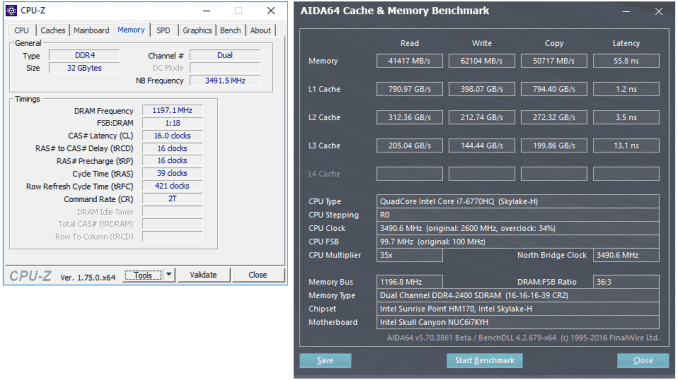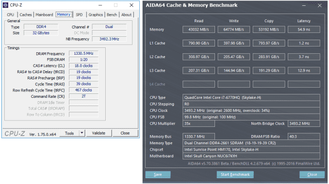 CPU-Z shows the operating parameters of the SODIMMs as seen by the OS. AIDA64 also has a quick cache and memory benchmark that provides some basic bandwidth and latency numbers to ensure that the kits are operating as expected.