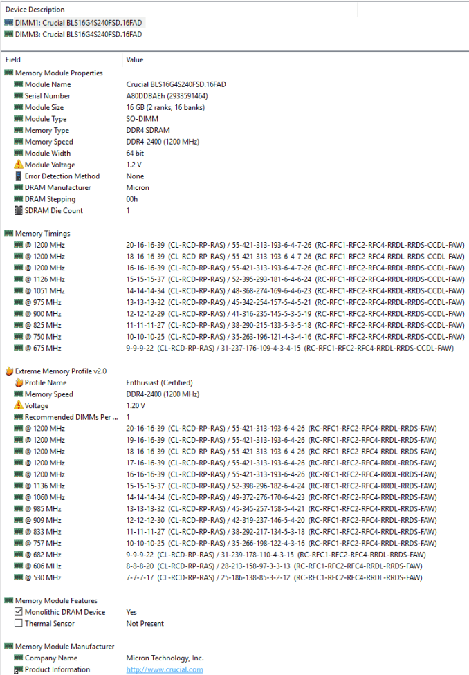 - Crucial Ballistix Sport LT DDR4 SODIMM 2x16GB @ 2400 MHz, 16-16-16-39