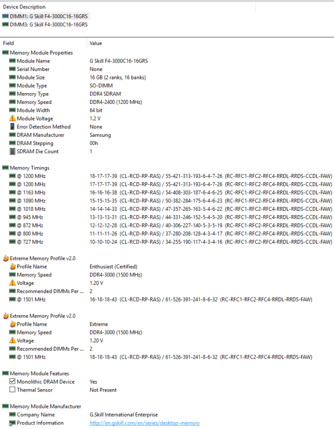 The G.Skill Ripjaws memory kit used in this study turns out to be an excellent candidate in terms of specifications. Not only does it operate at higher frequencies compared to all other kits in the review, it also has better latency numbers compared to the Corsair and Patriot kits which operate at lower frequencies. AIDA64 shows that the kit also supports two XMP profiles for the highest operating frequency (DDR4-3000), one at 16-18-18-43 and another at 18-18-18-43. The memory is sourced from Samsung.