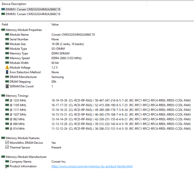 - Corsair Vengeance DDR4 SODIMM 2x16GB @ 2666 MHz, 18-19-19-39