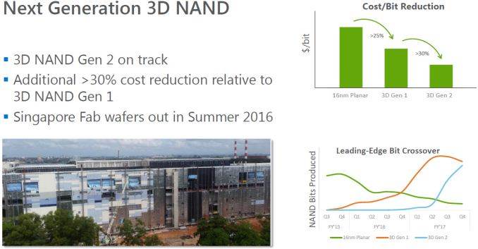 Micron last week made two announcements regarding its transition to 3D NAND memory. According to the company, the output of 3D NAND at its fabs has surpassed the output of 2D NAND in terms of bits. Meanwhile, the costs of the first-generation 3D NAND are in line with expectations and the company is gearing up to start high-volume production of its second-gen 3D NAND in the coming weeks.