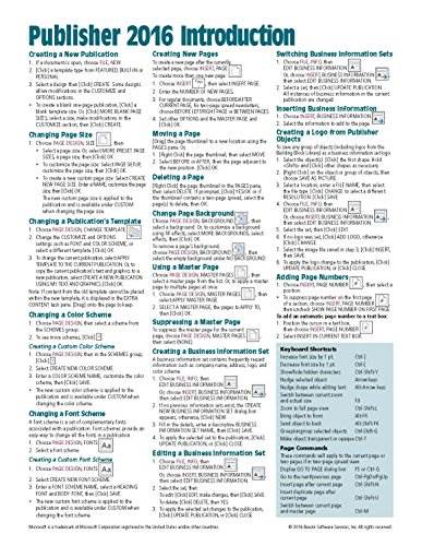 This two page laminated quick reference card shows step-by-step instructions and shortcuts for creating publications such as brochures and newsletters for business or home. Written with Beezix’s trademark focus on clarity, accuracy, and the user’s perspective, this guide will be a valuable resource to improve your proficiency in using Microsoft Publisher 2016. This guide is suitable as a training handout, or simply an easy to use reference guide, for any type of user.