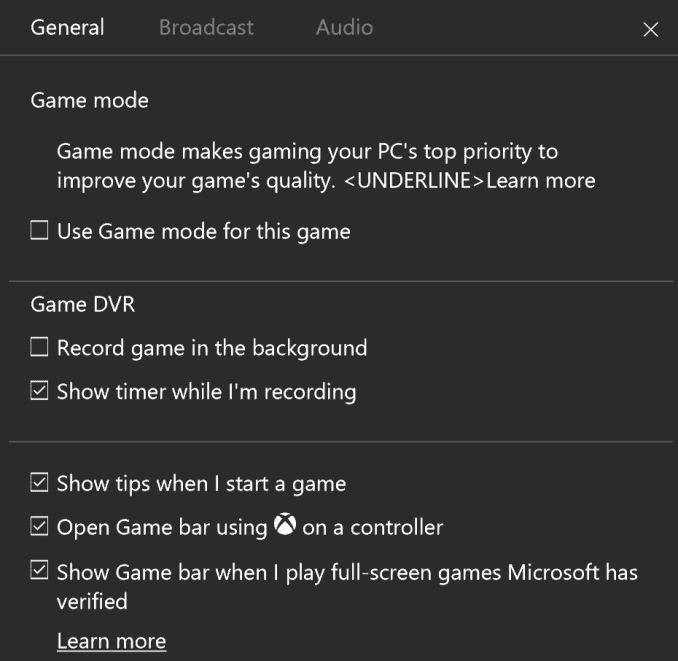 Game Mode settings in the Game Bar, not enabled yet