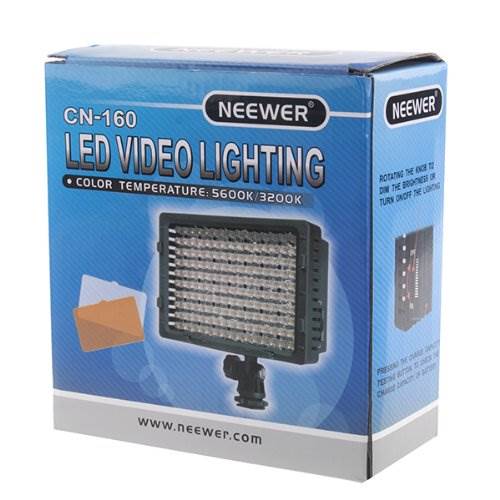 The Neewer CN-160 can mount to any standard hot shoe on most DSLR or digital video cameras as well as tripods and light stands equipped with a hot shoe mount or 1/4″ thread. It is also equipped with a pivoting head, allowing you to raise or lower the light’s angle. The light is battery powered and requires 6x AA Lithium Ion batteries (not included). With the included battery adapter, you can substitute the AA batteries for Sony NP-FH NP-FM NP-F Series, or Panasonic CGR-D16S rechargeable batteries. Battery life can easily be monitored using the battery power indicator located under the battery compartment. The Neewer CN-160 LED Video Light is easy to install and use and will make a great addition to your photography or video studio.