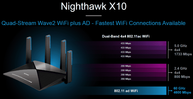 Similar to the other AD7200 routers in the market, the Nighthawk X10 adopts a dual band 4×4 802.11ac solution for (1733 Mbps + 800 Mbps) and a 1×1 802.11ad solution for 4600 Mbps to justify the AD7200 tag.