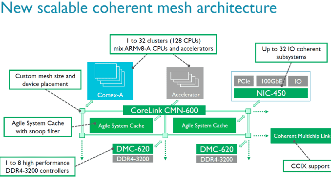 The previous generation interconnect, the CCN-512, could support 12 clusters of 4 cores and maintain coherency, allowing for large 48-core chips. The new CMN-600 can support up to 128 cores (32 clusters of 4). As part of the announcement, There is also an agile system cache which a way for I/O devices to allocate memory and cache lines directly into the L3, reducing the latency of I/O without having to touch the core.