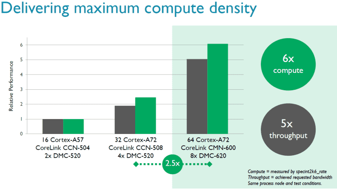 If you double the number of cores and memory controllers, you expect twice as much performance in the almost perfectly scaling SPEC int2006_rate. ARM claims that their simulations show that 64 A72s will run 2.5 times faster than 32 A72 cores, courtesy of the improved memory controller. If true, that is quite impressive. By comparison, we did not see such a jump in performance in the Xeon world when DDR3 was replaced by DDR4. Even more impressive is the claim that the maximum compute performance of a 64x A72 SoC can go up by a factor six compared to 16x A57 variant. But we must note that the A57 was not exactly a success in the server world: so far only AMD has cooked up a server SoC with it and it was slower and more power hungry than the much older Atom C2000.