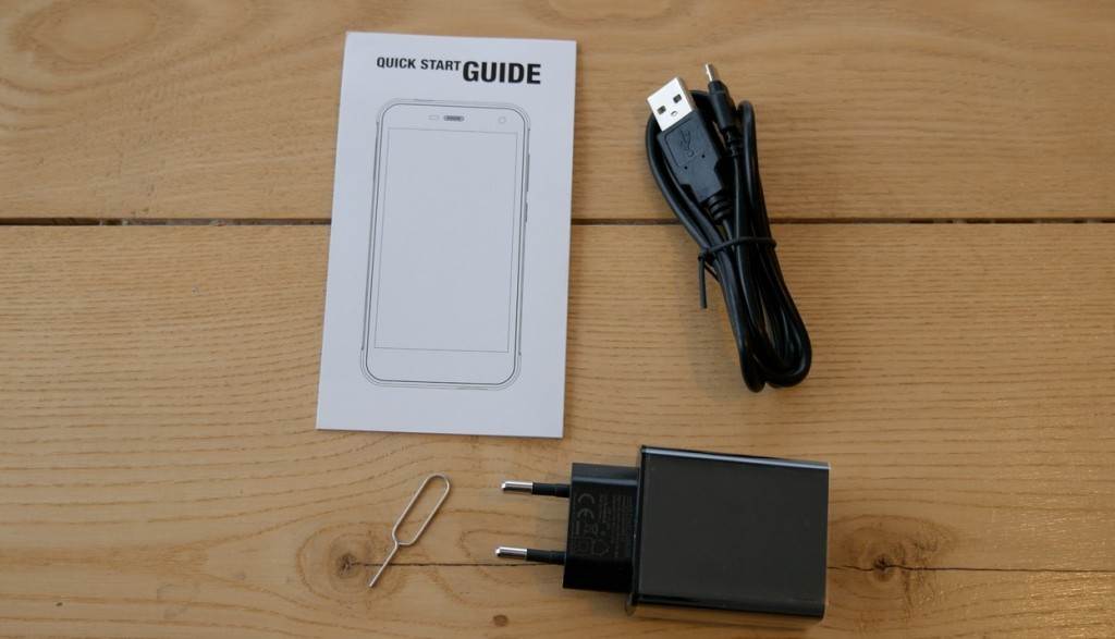 The box includes a charger (euro plug), a microUSB cable, a pin to open the tray, an instruction in English and a warranty card.