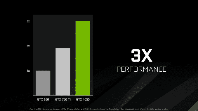 It’s telling then that NVIDIA has informed the press that the higher TDP cards with an external power connector are going to have much higher boost clocks. Whatever is going on under the hood, power plays a big part, and at a TDP limit of 75W, GP107 isn’t getting all the room it needs to stretch. Meanwhile it’s also noteworthy that NVIDIA’s own marketing materials call for GTX 1050 to have a 3x performance increase over GTX 650, and only a bit over 50% increase over GTX 750 Ti.