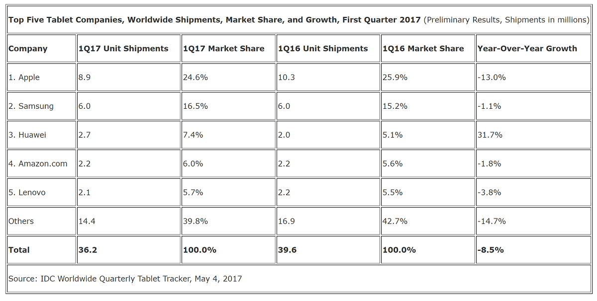 Tablets continue to show their true colours as a failed experiment, as the market contracted once again, this time by 3.4 million units or a catastrophic 8.5% in Q1 2017.