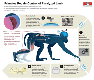 The animals had two implants — one in the brain and one in the lower part of the spinal cord. The team first trained a computer to decode the brain signals that corresponded to leg movements in healthy monkeys. Then they partly cut the spinal cord of one to see if the system could allow movement.