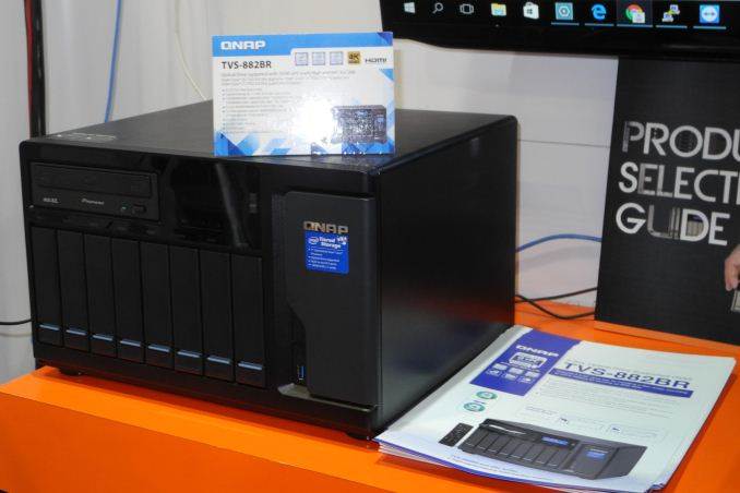 The TVS-882BR is a 8-bay NAS with a SATA expansion bay that can either support two slim optical drives or one 5.25″ optical drive. It is based on a Kaby Lake platform, supports PCIe NVMe SSDs and also two M.2 SATA SSD slots. There are three PCIe 3.0 expansion slots and three display outputs.