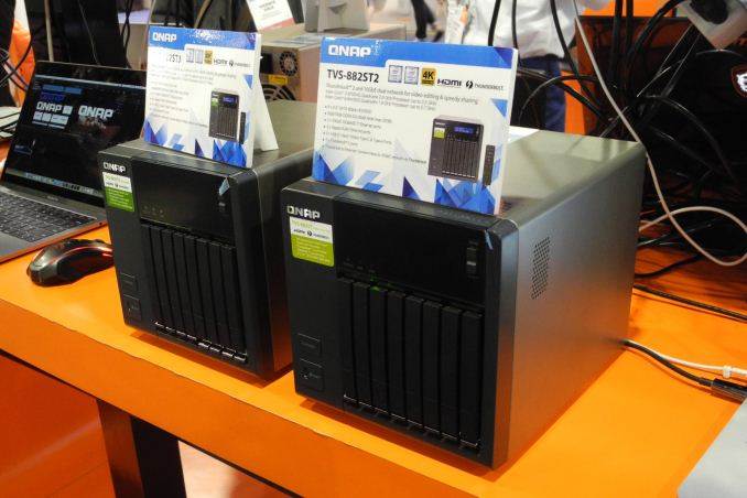 QNAP also introduced the 2.5″-only TVS-882ST models – The TVS-882ST2 has Thunderbolt 2 ports, while the TVS-882ST3 has Thunderbolt 3 ports. Unlike the flagship TVS-1282T3, these units use the high-end Skylake mobile CPUs (Core i7-6700HQ or Core i5-6442EQ). The brochure for the TVS-882ST series also brings out the two Thunderbolt usage scenarios – as a direct-attached storage unit (with the expansion units allowing as much as 400TB to be accessed directly), or a 10Gb switch (with the virtual switch feature that can act as a Thunderbolt to Ethernet converter) to create a 10Gbps interface for the system connecting to it. The second feature makes a separate Thunderbolt to 10Gbps converter unnecessary.