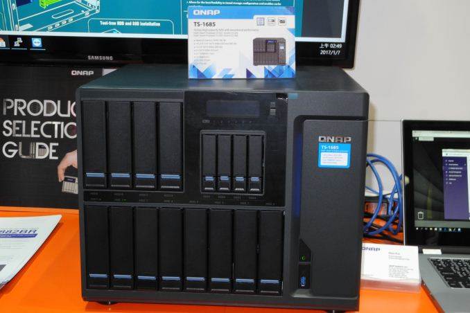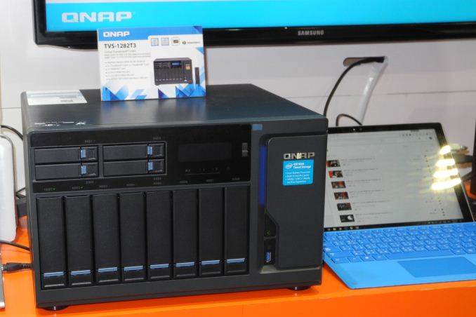 We last looked at QNAP’s offerings in our coverage of their TVS-x82T launch back in May 2016. One of the questions I had asked at the launch event was about the non-availability of Thunderbolt 3 (the TVS-x82T series came with Thunderbolt 2 ports). At CES 2017, QNAP introduced the first set of NAS units with Thunderbolt 3 support – with the TVS-1282T3 being the flagship in that segment. Sporting 8x 3.5″ bays and 4x 2.5″ bays along with 2x M.2 SATA SSD slots, the unit can be configured with either a Core i5-7500 or Core i7-7700 CPU. Available I/Os include 2x Thunderbolt 2 as well as 2x Thunderbolt 3 ports, 2x 10GBASE-T and 4x GbE network links, five USB 3.0 ports (one in front, four in the back), two microphone inputs, and two speaker outputs as well as a 3.5mm audio line-out. There are four SODIMM slots, allowing end-users to configure the system with up to 64GB of RAM.