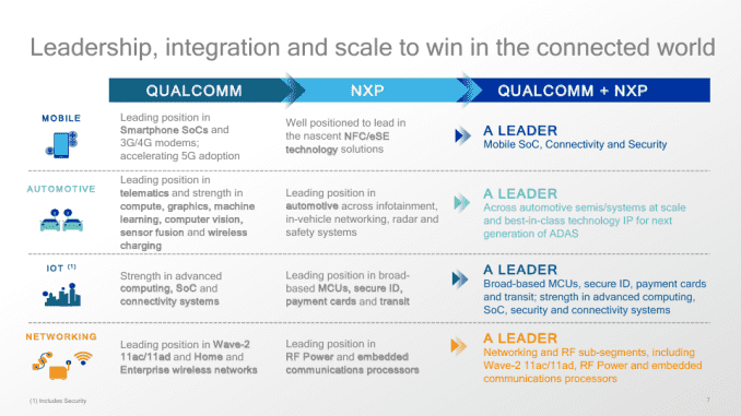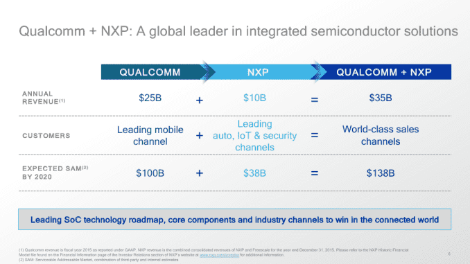 While Qualcomm and NXP overlap in certain areas, they aren’t direct rivals in any significant sense of the word; the sum of their revenues come from different markets. Therefore, the acquisition will be complementary for Qualcomm because it greatly expands its addressable markets (potentially up to $138 billion in 2020) and brings thousands of new clients (Qualcomm says that NXP serves 25K direct and indirect customers). The combined company will have revenue of well over $30 billion and will be the world’s No. 3 supplier of semiconductors after Intel ($51 billion in 2015) and Samsung ($40 billion), based on rankings from IHS. Keep in mind that Samsung sells tons of commodity DRAM and NAND flash memory, whereas the new Qualcomm will specialize on various general purpose, automotive, IoT and special purpose computing solutions. In fact, the new Qualcomm will be a rather unique company with no direct rivals of comparable sizes, as companies like Avago (together with Broadcom), MediaTek, Texas Instruments, Renesas and other earn considerably less.