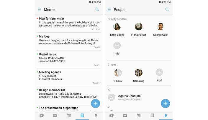 Samsung Focus, an all-in-one productivity app, helps business users focus on what matters most. The productivity solution accomplishes this by providing quick access to email (available with multiple accounts), calendar, memo, contacts from a single app via a tabbed interface.