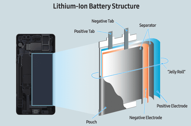 Ultimately, these investigations revealed that the Note7 fires were caused by different design and manufacturing defects in the batteries from both suppliers. The lithium-ion batteries used in the Note7 were constructed from long strips of an insulating separator sandwiched between positive and negative electrode foils spirally wound to create an electrode assembly inside a heat-sealed polymer pouch. Electrode tabs were welded to the positive and negative foil electrodes for external connection points.