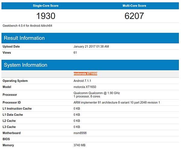 A Motorola Android smartphone powered by the octa-core Qualcomm Snapdragon 835 chipset has appeared on the Geekbench benchmark database. What is strange however, is that the device carries the model number XT1650, which actually belongs to the Moto Z. While it is possible that the device caught on Geekbench could be a Moto Z (2017) prototype, it will definitely not be carrying the same model number as the Moto Z.
