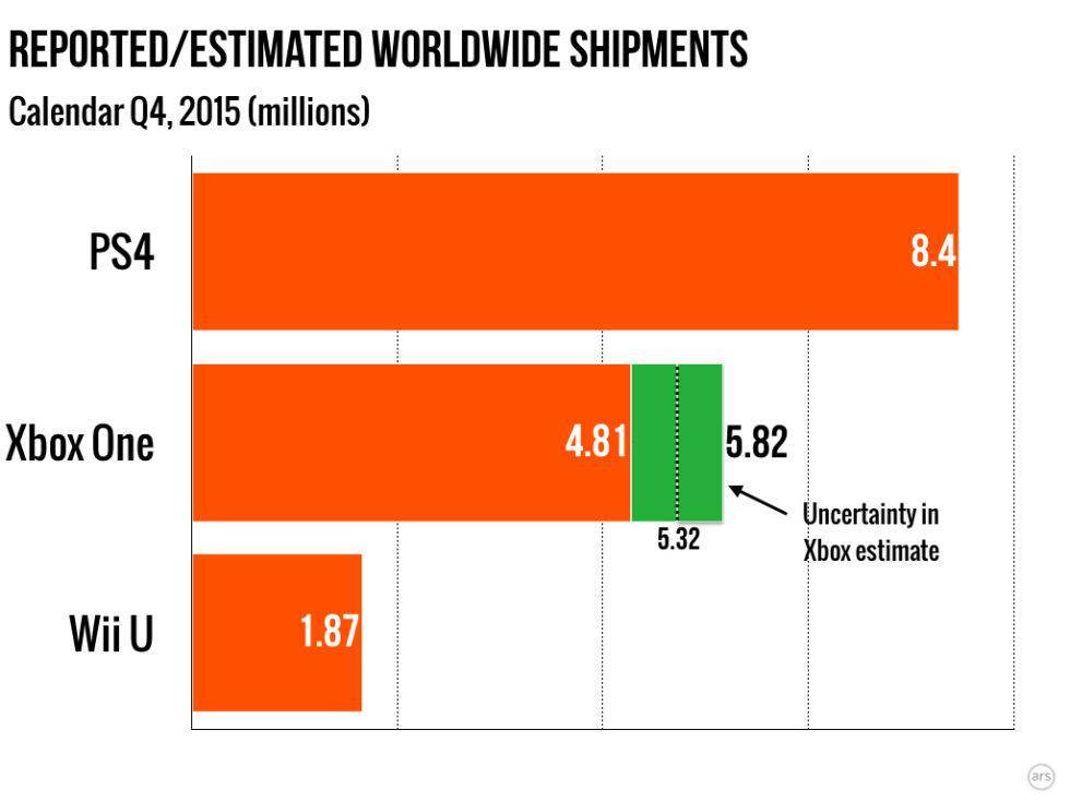 Fig. 1: PS4’s record-setting holiday quarter shipments easily outpaced estimates for Xbox One shipments over the same time.