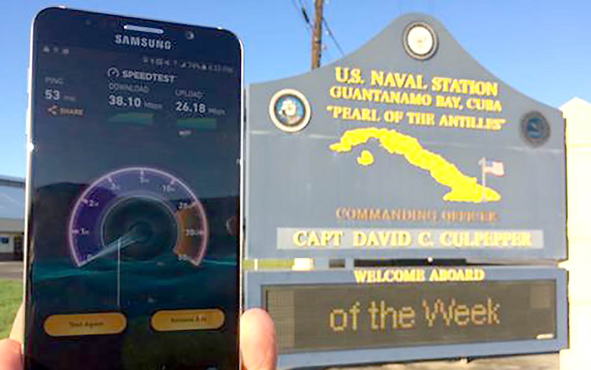 Gitmo residents get the same level of service as folks on the mainland, and a screenshot (above) shows healthy 38 Mbps upload and 26 Mbps download speeds. As of August, residents could buy postpaid and prepaid T-Mobile plans, along with smartphones and accessories, from a retail kiosk in the Navy Exchange store.