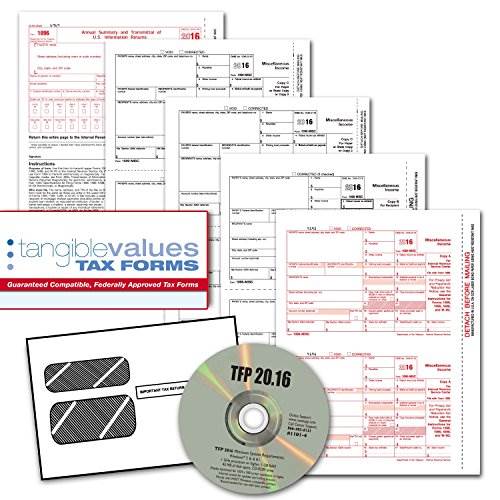 Federally approved and compliant. By the premier Tax forms supplier, Tangible Values. Includes easy to use TFP Small Business software to prepare, print and file all necessary documents for up to 50 indivduals/suppliers. 2016 version has easy, fast installation with direct access to help and technical support. Software includes 10 Free E-Files for online submission of your W2, 1099 and other forms.Tangible Values 1099 Misc Laser Forms (4-Part) Kit for 50 Individuals/Suppliers (2016)