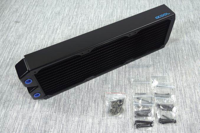 Perhaps the most important part of the system is the massive NexXxoS XT45 radiator. Alphacool supplies it along with mounting and fan screws, as well as with four plugs.