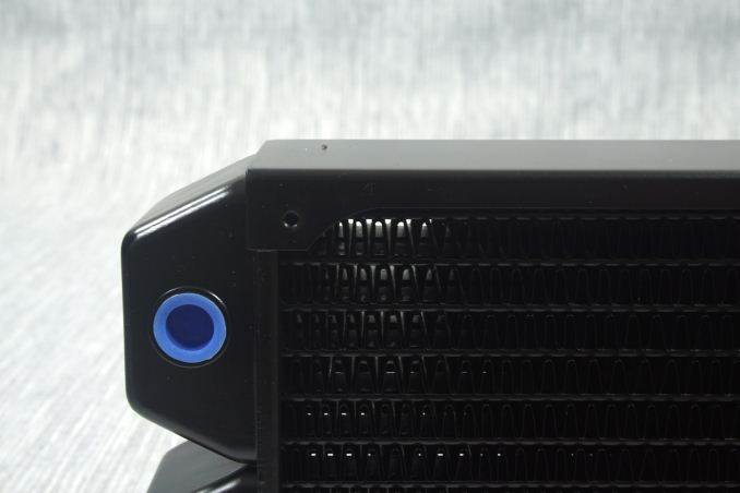 Alphacool placed not two but six openings for compression fittings, which is why they also supply four plugs alongside with the radiator. The user can select two of the fittings with the most suitable orientation, or even connect more than one loop/system to a single radiator.