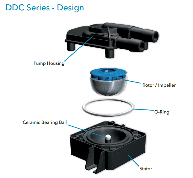 Although it looks like a very simple plastic apparatus, the DDC-1T is actually one of the best low-voltage DC pumps currently available. It utilizes a hemispherical motor that does not require shaft bearings and/or seals, significantly improving reliability and minimizing noise. The DDC-1T is also very powerful for a 10W device of this size with, according to Alphacool, a maximum discharge head of 3.7 meters and a maximum flow of 420 l/h. Goulds Water Technology states 4.5 m head and 410 l/h respectively in their specifications sheet.