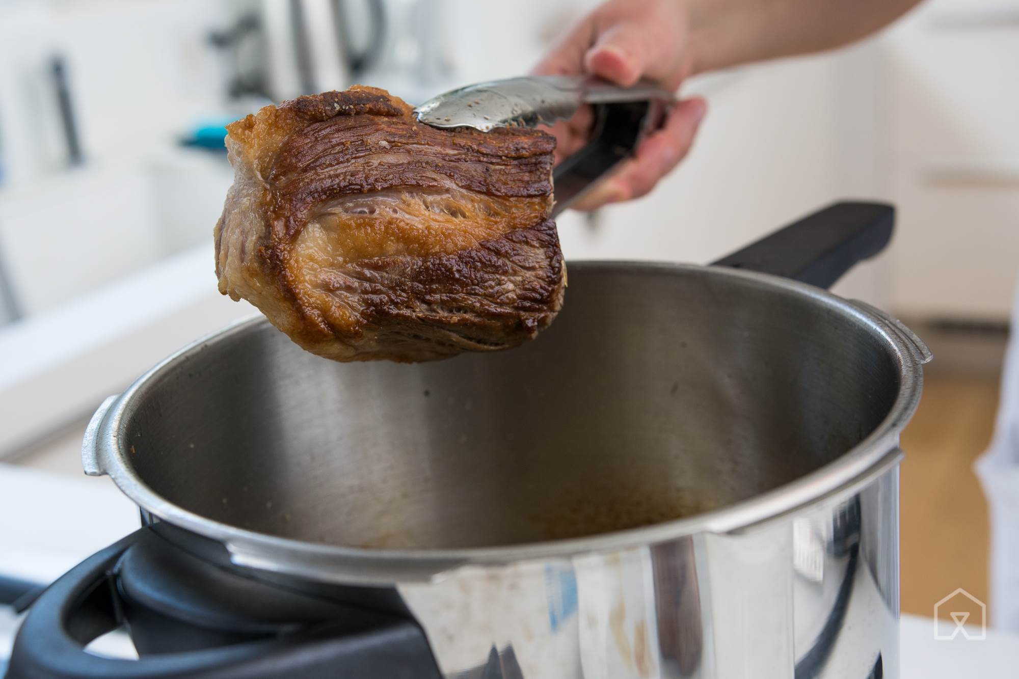 Brisket browned darker in stovetop cookers, like this one from Kuhn Rikon. Photo: Michael Hession