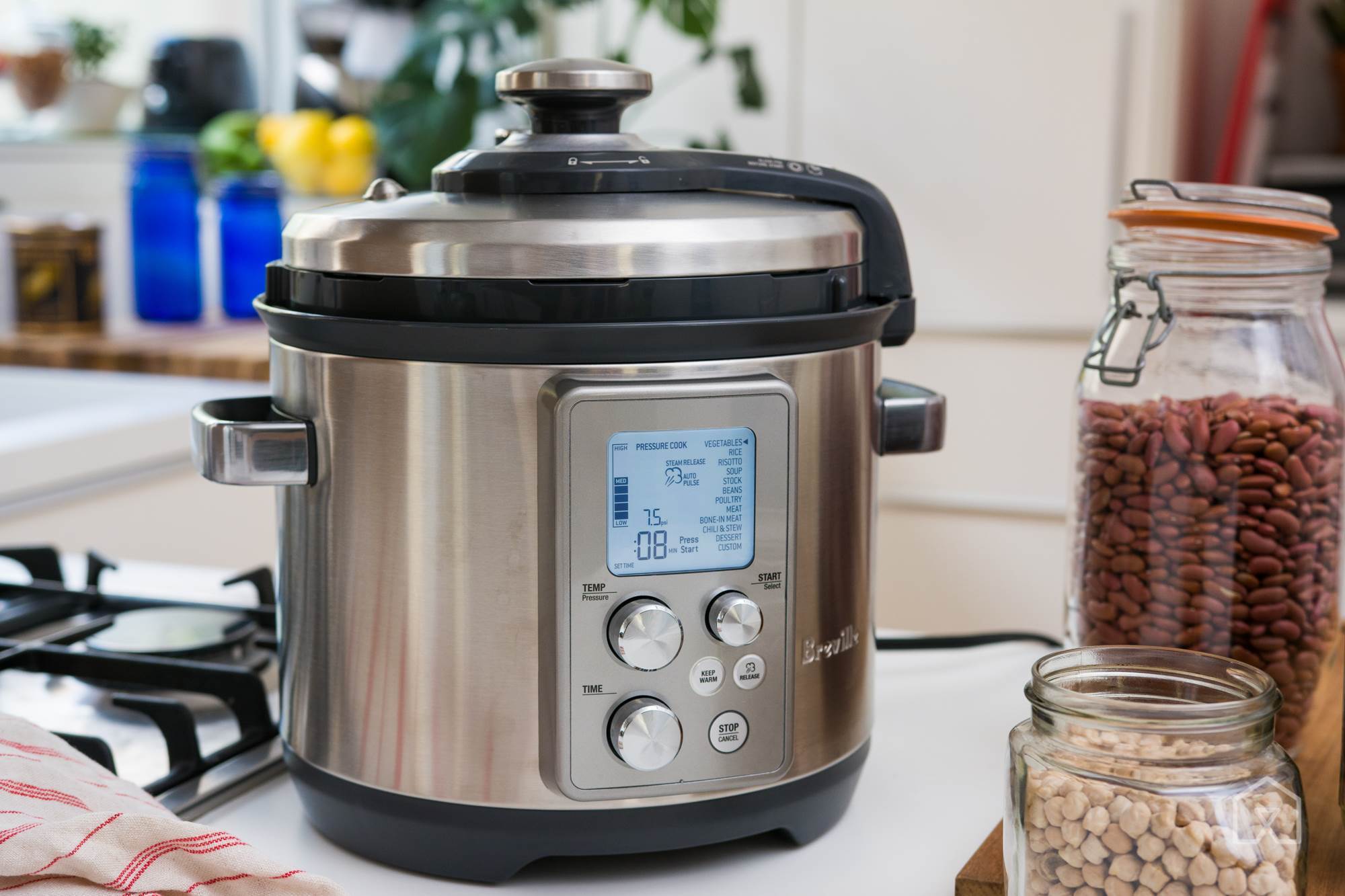 If you want a slightly nicer electric pressure cooker, we’d go for the Breville Fast Slow Pro. Its interface is more streamlined than the Instant Pot’s, using dials and a big LCD screen rather than a bunch of buttons. It also has a better selection of venting methods to cook delicate foods or release pressure more quickly, and a really handy altitude setting. It’s harder to clean, though, and we don’t love the nonstick insert. We think this is worth the upgrade if you live at high altitude or need a completely hands-off cooking device.