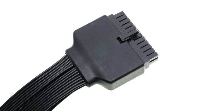 All of the Whisper M units are fully modular, with “flat” ribbon-like cables. The wires and the connectors are all entirely black. An interesting feature here is the bulky connector of the 24-pin ATX cable. The large plastic cover is not there solely for aesthetic purposes but it actually hides three solid-state capacitors that are being used for extra ripple suppression. This is the first time that we have seen the designer of a PSU employing capacitors outside of the unit’s body.