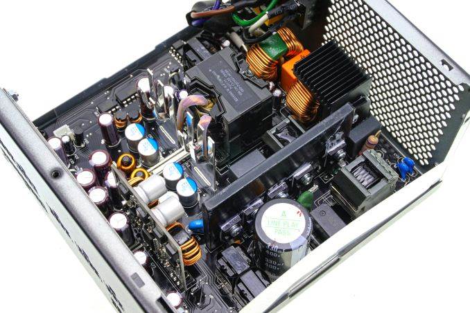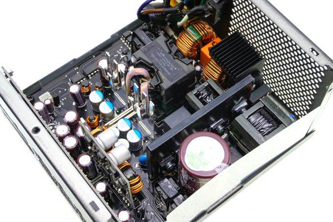 Another major component difference between the two units are the PFC components, with the 450W unit using a Nichicon 330μF capacitor, whereas the 850W version has a Nippon Chemi-Con 680μF capacitor installed. The APFC inductor is also notably larger and the active components are significantly more powerful. Two transistors form a relatively simple half-bridge primary inversion side with its efficiency boosted by an LLC resonant converter. The four secondary side conversion stage transistors that generate the 12V output are attached to the underside of the main PCB and cooled by the silvery heatsinks next to the main transformer. The 3.3V and 5V outputs are generated by DC-to-DC circuits found on the small vertical PCB.