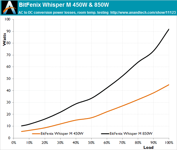 Both the 450W and the 850W version of the BitFenix Whisper M PSU honored their 80Plus Gold certification without issues. The 450W version actually fared a little better, with an average nominal load range (20%-100%) efficiency of 91.2%. It is only slightly higher than that of the 850W version (91%), but we can see the 850W version only barely surpassing the 92% mark at 50% load, where the 450W version exceeded it with ease, peaking at 92.5%. We can also notice that the 450W model is substantially more efficient with loads lower than 300 Watts. This is not an issue of any kind; the narrow power range of the 450W model simply allows it to perform much better when lightly loaded. The powerful 850W model technically reaches its nominal load range with a load of 170 Watts and above, in the range where the 450W model is already moving towards peak efficiency.
