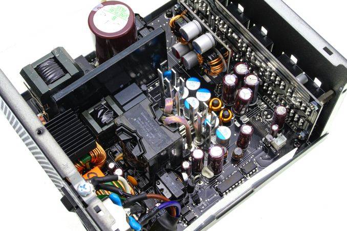 Another major component difference between the two units are the PFC components, with the 450W unit using a Nichicon 330μF capacitor, whereas the 850W version has a Nippon Chemi-Con 680μF capacitor installed. The APFC inductor is also notably larger and the active components are significantly more powerful. Two transistors form a relatively simple half-bridge primary inversion side with its efficiency boosted by an LLC resonant converter. The four secondary side conversion stage transistors that generate the 12V output are attached to the underside of the main PCB and cooled by the silvery heatsinks next to the main transformer. The 3.3V and 5V outputs are generated by DC-to-DC circuits found on the small vertical PCB.