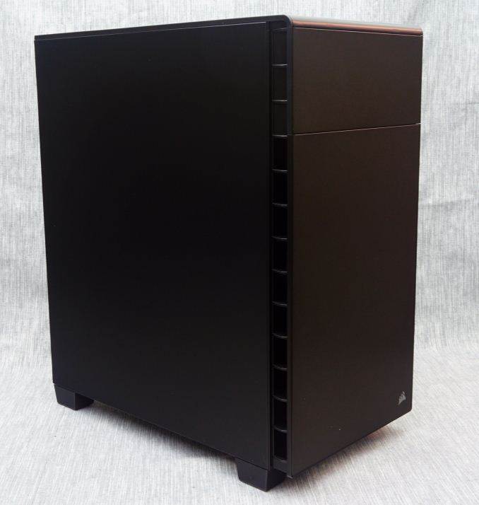 The metallic surfaces of the Carbide 600Q are very smooth, sprayed with a satin black paint that is highly resistant to fingerprints. A small door on the front panel hides the two 5.25” device bays. It has a magnetic latch and opens to the left side of the case only. Corsair also offers the 600C, a similar case but with a windowed right side panel instead, sacrificing sound absorption and utility for aesthetics.