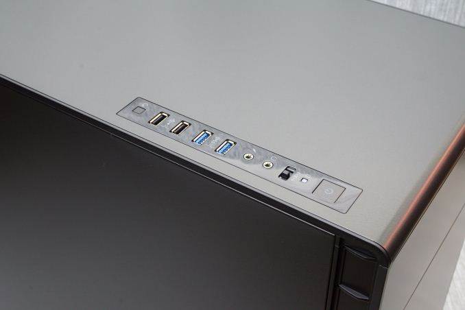 The front I/O ports and buttons can be found aligned across the left side of the top panel. A large square power on button can be seen towards the front of the array, followed by a simple 3-way fan controller switch, 3.5mm audio jacks near the center, two USB 3.0 ports, two USB 2.0 ports, and finally a small square reset button.