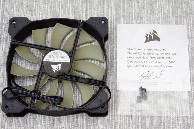 By default, the case has two 140 mm fans installed. A third 140 mm fan however is supplied along with the case, packed along with its mounting screws and a thank you note inside a small box. The user can decide the mounting location of this 140 mm fan, or choose not to install it at all in favor of lower noise levels.
