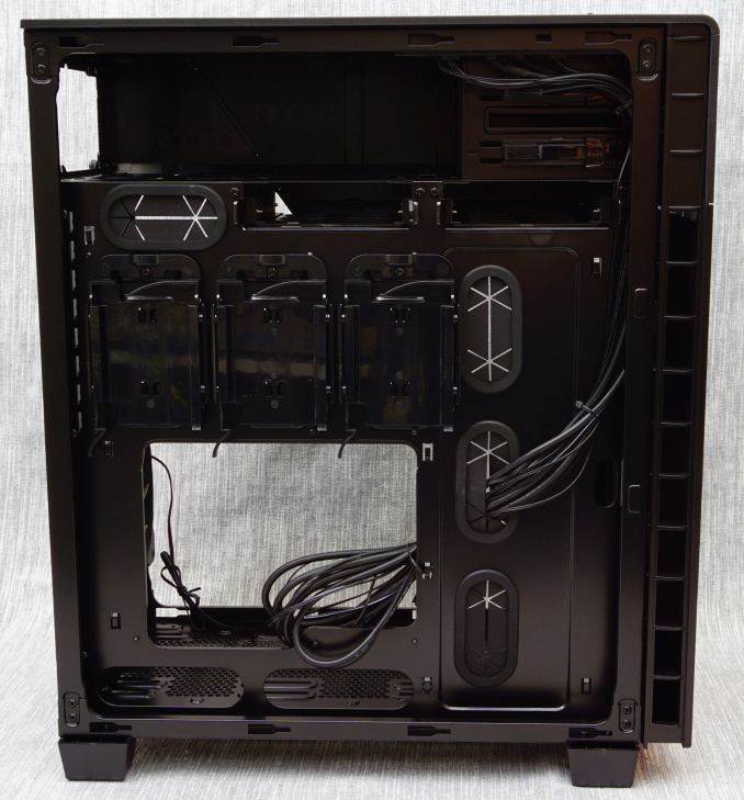 There is a very large opening on the motherboard tray for the installation of aftermarket CPU coolers, so large that it will extend beyond the boundaries of a Flex-ATX or smaller motherboard. Only a full ATX or Extended ATX motherboard will fully cover the opening. Large openings with rubber grommet coverings for the routing of cables can be seen to the left and above the motherboard area. Two narrow but long openings can be seen below the motherboard, without any grommets installed.