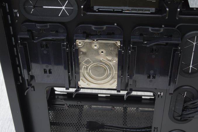 Corsair moved all of the drives to the left side of the case, behind the motherboard tray. Two 3.5” drives can be installed in the slots found beneath the PSU compartment, on plastic trays. These plastic trays can also accommodate 2.5” drives, if required. Three plastic 2.5” drive cages can be seen directly behind the motherboard, allowing the quick and tool-less installation of devices.