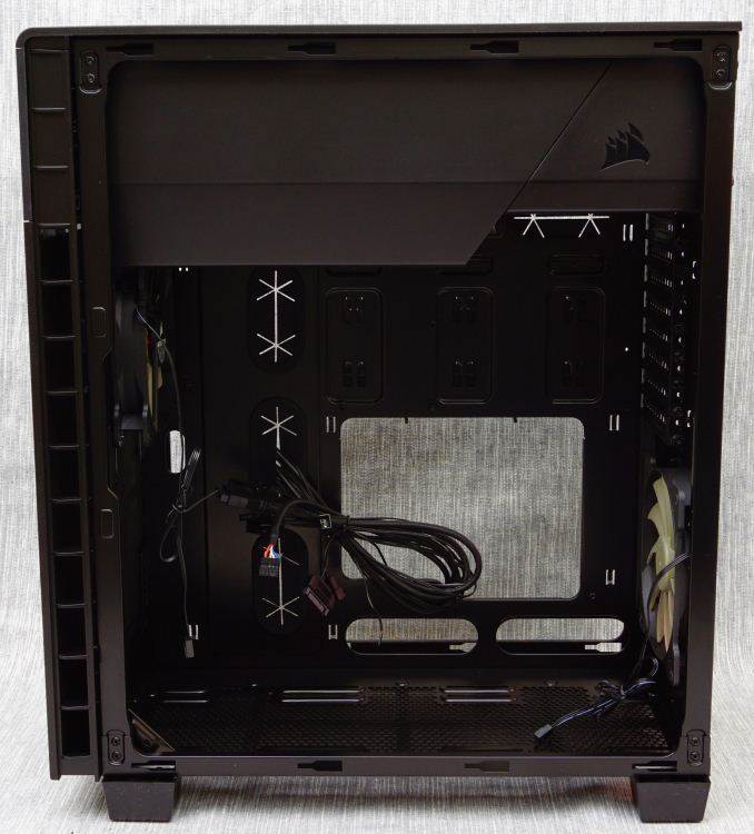 The removal of the case’s panels reveals a simple but very interesting interior, with an inversed motherboard tray, meaning that the motherboard is literally upside down. Corsair based this design on the simple concept that the cool air sinks towards the bottom of the case, making the front and bottom fans more effective as intakes and the rear fan more effective as an exhaust. Furthermore, it allowed the designer to seal the top of the case, significantly improving its acoustics performance.