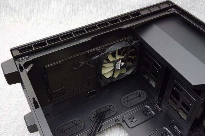 The bottom of the case serves as its main air intake, requiring substantial clearance via four tall rectangular legs. A large nylon filters covers the entire intake, which can be removed by pulling it from the rear of the case. Considering the length of the filter, I worry that it will be a pain to remove with the case beneath a desk, or even on a desk if the desk sits against a wall. It would have been far more practical if the designer allowed the user to pull the filter off from the front of the case.