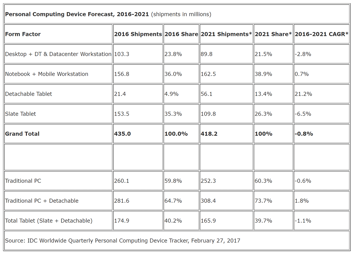 For an industry built on growth that is probably not the best news however, but the good news is that the IDC expects a much more robust 21.2% growth in the Detachabe PC market to 56.1 million units by 2021.