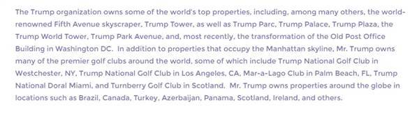 More than one-quarter of Trump’s bio refers to his business properties around the world.