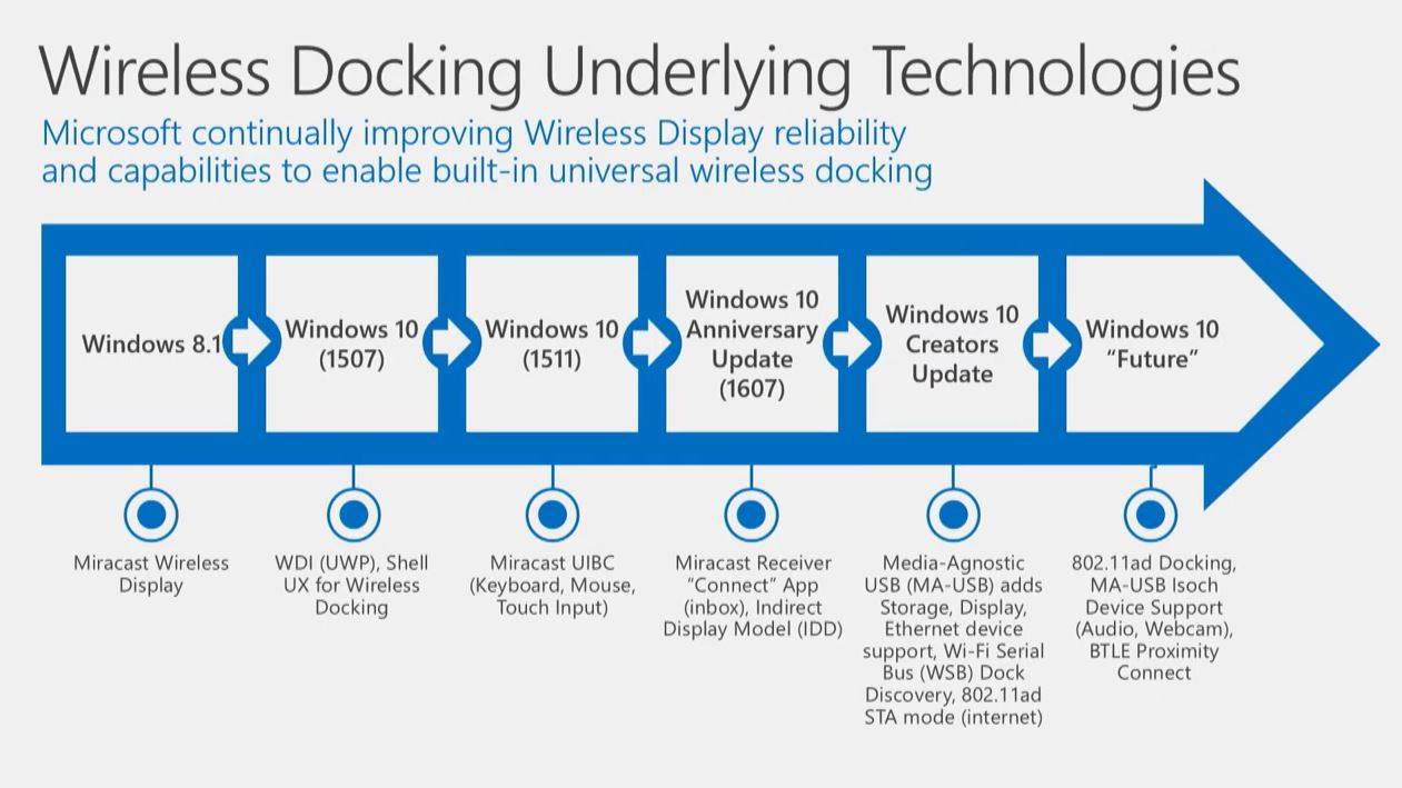 In one of the sessions, Microsoft spoke about the multiple technologies that Windows 10 supports to enable docking scenarios ranging from USB-C to 802.11ac. They also revealed the investments they are making in Windows 10 to enable great wired and wireless docking scenarios. Windows 10 Creators Update will add 802.11d wireless support, WSB Dock Discovery and more. Find more information from the slides embedded below.