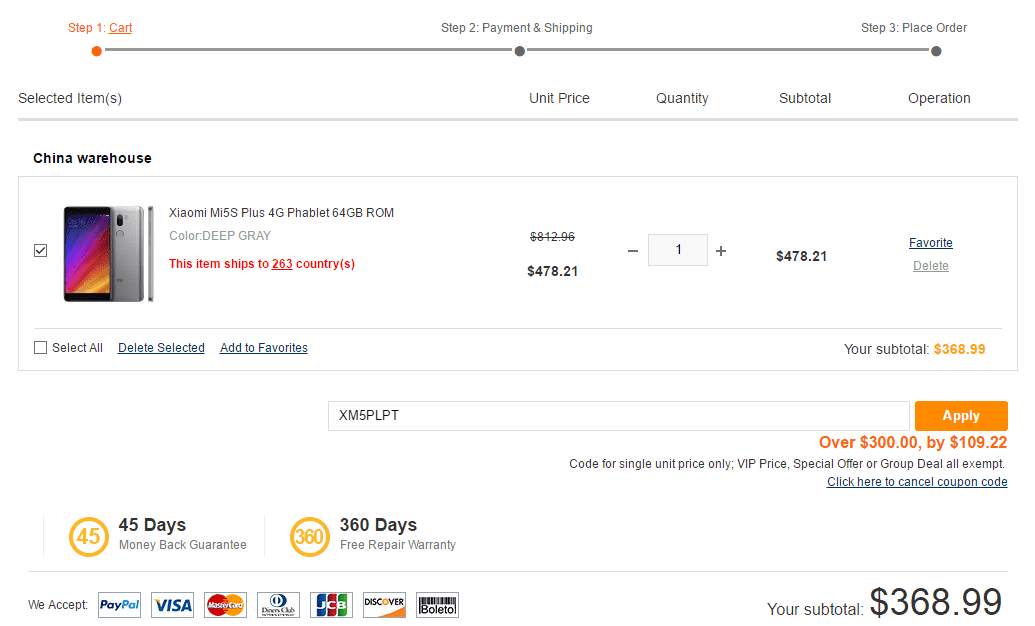 The Xiaomi Mi 5s Plus comes in Rose Gold, Gold, Deep Gray, and Silver white colors. The Mi 5S Plus version with 4GB + 64GB is currently on Gearbest for $368.99 with coupon code XM5PLPT. This is a limited time offer and so you have to hurry up. You’ll be required to input the Coupon code, also called Promotion code on checking out in your cart, that is when you add the coupon and get the amazing discount.